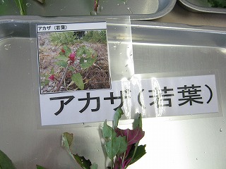 【左】日程・野草の調理法・採集する野草写真が掲示されています。 【中】野草の展示 【右】食べられる野草のお話を聞いています。