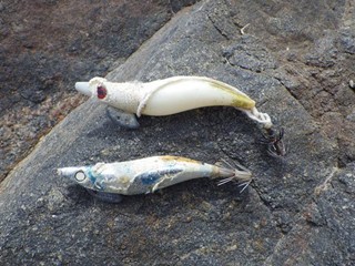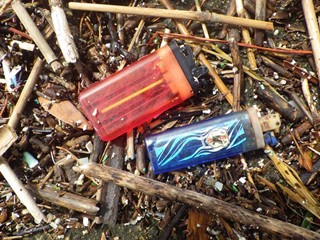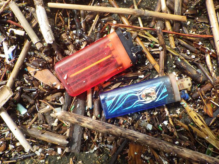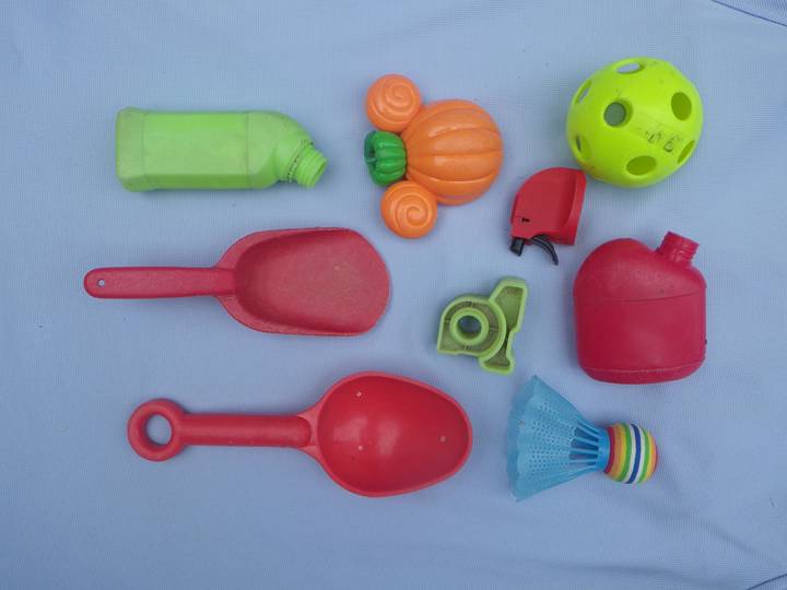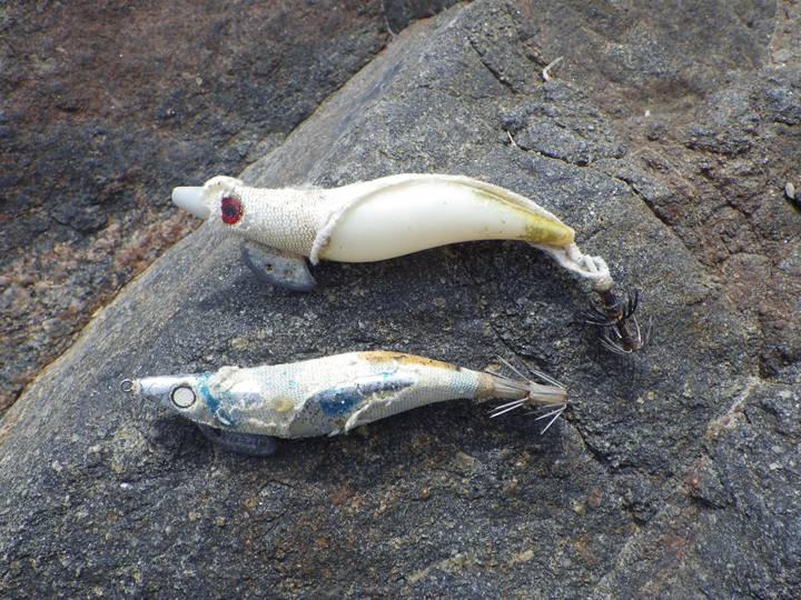 【左】ライター。糸で結びやすいもの 【中】釣り具(疑似餌など) 【右】カラフルなプラスチック製品…色取り用
