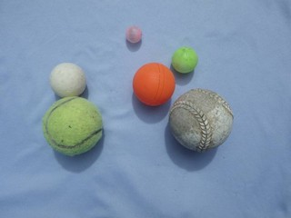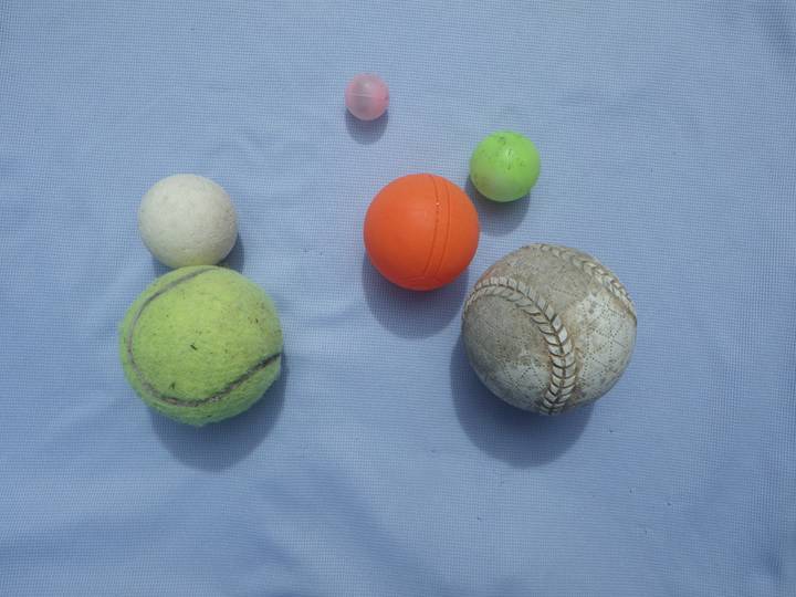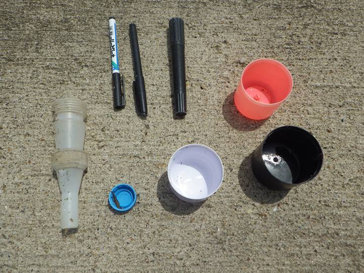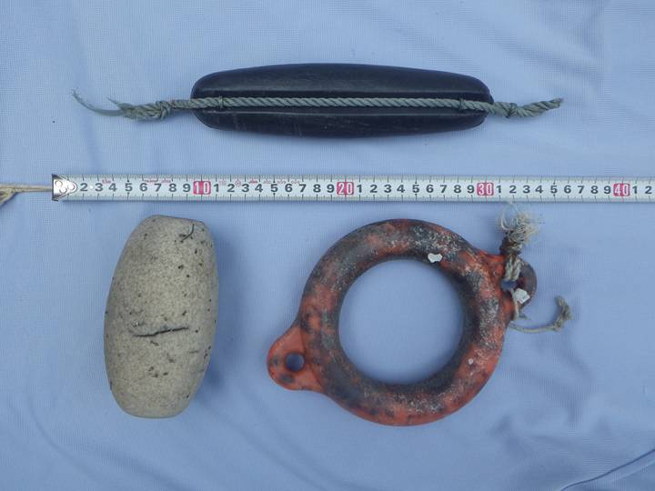 【左】文房具やスプレー缶のキャップ 【中】ボール(球体)…糸で結ぶのが大変 【右】大きめの漁具…枝が短いため