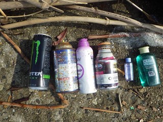 【左・中】液体の容器やスプレー缶。 ペットボトルも当然含む 【右】靴やサンダルなど ※左端の一足は現在使用中(私用)