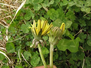 【左】左、セイヨウタンポポ(総包片が反り返っています)。右、トウカイタンポポ。