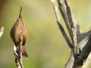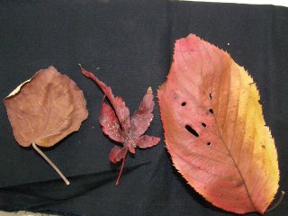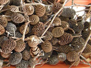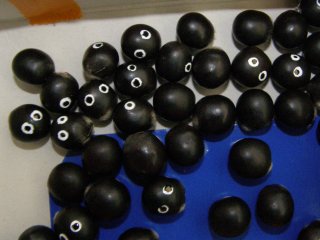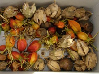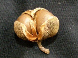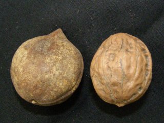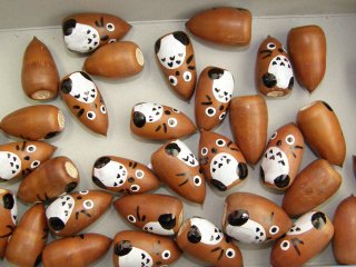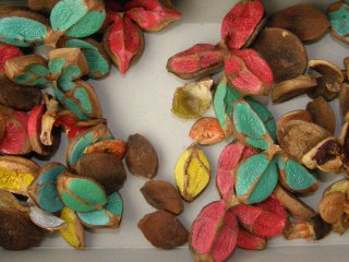 【左】ツバキの種子が入っていた皮に色付けしたもの。