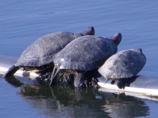 【左】アリさんに似たクモ、アリグモがハエを捕らえました。 【右】ミシシッピーアカミミガメ(外来生物)の甲羅干し