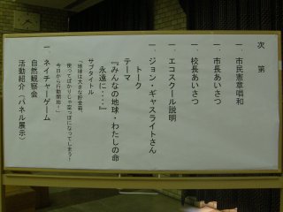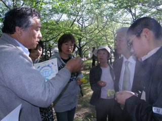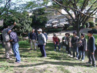 4月20日(日)東海市役所地下大会議室で開校式があり、市民、関係者160名の方が来ていただきました。市長から開校にあたっての挨拶があり、つづいて東海市エコクール校長になりました日本福祉大学の千頭教授から挨拶がありました。記念講演としてジョンギャスライトさんの楽しい自然についてのお話がありその後、出席者の中で希望者を募りミニ体験自然観察会を大池公園で行いました。ミニ体験自然観察会の様子は下記の写真です。
