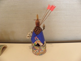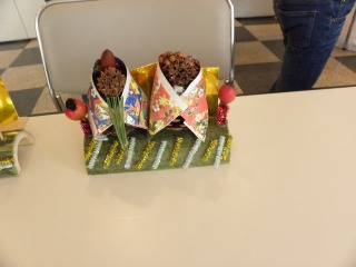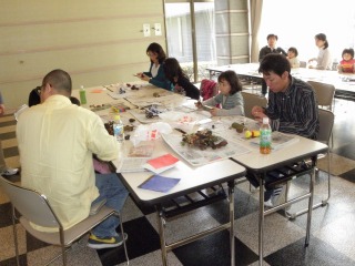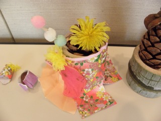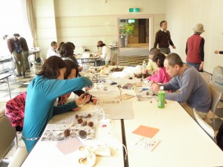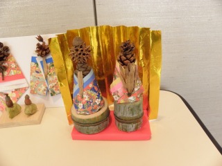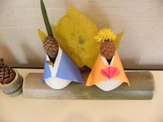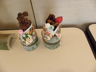 商工センターの竹を切って作っておいた輪切りの竹や節の部分を上手に使って、私たち東海市と大府市の指導員が用意したいろいろ松ぼっくり(アカマツ、クロマツ、ツガなど)やいろいろなドングリや木の実を、千代紙、色紙、木切れなどを使ってかわいく飾って、みなさんとても立派な作品をつくることができました。(記・吉川洋)