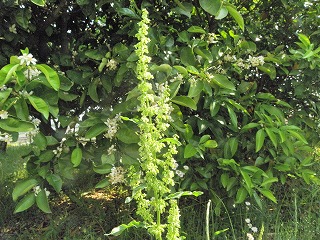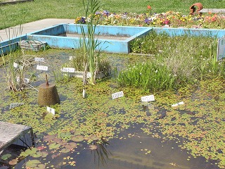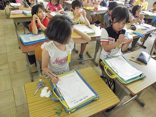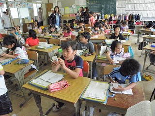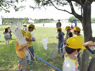 フナビオは平成18年に完成、4年経過したそうです。しかし水源の井戸水の鉄分の影響なのか、この日もイトトンボのすがたはなく水生昆虫がいまいち定着していないようです。天気は晴れ、暑くなりました。9:15に船島小に到着、降幡さんは8:30に来たそうで、吉房さんも9:30には校庭を1周したとのこと、皆やる気満々です。9:30に会議室に集合、校長、教頭先生からスケジュール等について聞いた後、校庭に出て組み分けし、9:40から観察を開始しました。3年2組の約35名を竹内さんと半分づつ担当することになりましたが、頼んで一緒にしてもらいました。まず一本のトベラの木を観察しました。葉につくトベラキジラミを拡大するとセミにそっくりなところを見せて驚ろかそうとしたのですがこれは全員に見せるには人数が多すぎて収拾がつかなくなり失敗しました。代わりに多くの目で見たのでテントウムシの幼虫、ごみを背中にしょったクサカゲロウの幼虫、セボシジョウカイなどの捕食者、アブラムシなどを見つけ、竹内さんからトベラに関わる食物連鎖の講義を受けました。次に樹木園に入り側溝の落ち葉の下にいるたくさんのモリチャバネゴキブリが森の掃除屋さんであることを教えたり、植物について興味ある話を聞きました。ここでひとつ間違いをしました。モリチャバネゴキブリや地面を這っていたツチカメムシを生徒に言われるままにすぐに捕まえてビンに入れてやったのです。生徒は味を占め、その後竹内さんとも別れ別れでトトロの道、らくだ山、ビオトープ、観察池と、暑さも手伝ってひたすら虫を見つけてはビンやかごに入れてやるだけの作業となりました。観察池の観察を11:00に終了し教室に戻って見つけた生き物の分かち合いをした後、11:50から会議室で反省会をして12:20にすべて完了しました。(記・平松俊)
