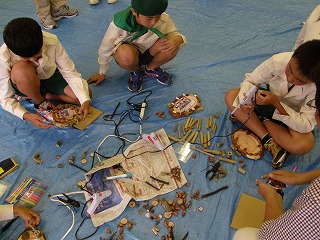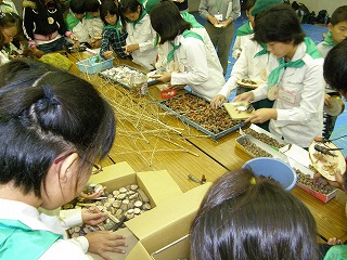 9:30から予定通り開会式を行い、市の課長、降幡代表の挨拶、県担当のスケジュールの説明後、榊原正さんから写真立ての作り方について説明を受け、団員は計画通り2団づつ混成の9組に分かれました。それぞれの組に指導員が2〜3名付いて写真たて作りに取り掛かりました。私は大野さん、村瀬さんと組んで東海市北部と知多市第2を受け持ちました。村瀬さんの指導で顔合わせの自己紹介からはじめました。グルーガンの使い方等については経験者も多く特にてこずる子はいませんでした。木の輪切りに木の実を並べるオーソドックスな写真立てが多い中、竹細工のクワガタを2匹も使った豪華なものを作る子もいて感心しました。私も挑戦しましたが小学1年生並だと笑われました。終了時刻の11:20になっても終われない子が何人かいて11:25に強制終了しました。10分前に残り時間を告げるべきだったと後悔しています。制作完了した組から記念撮影し、撮影終了後県の課長の閉会の挨拶と榊原正さんの作品についての助言をもって会を終了しました。