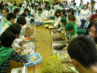班ごとに作った作品を持って記念写真