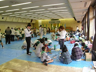 みどりの少年団交歓会としては珍しく雨になりました。8:40に市役所第一Pに到着、市大会議室には既にほとんどのメンバーが集まって工作用の材料を並べていました。降幡さん及び県、市の担当と打ち合わせて自然観察は中止とし、雨天時のプログラムで進めることをみんなに伝えました。9:00からの受付の間にスタッフ全員を別室に集め雨天時の進め方を再確認しました。