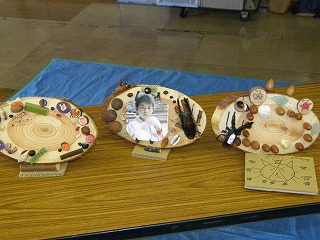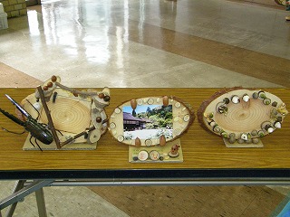 【左】【中】児童が製作した作品 【右】班ごとに作った作品を持って記念写真