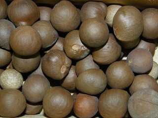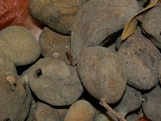 【左】イスノキの虫瘤 【中】枝のスライス 【右】ツバキの実の抜け殻