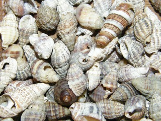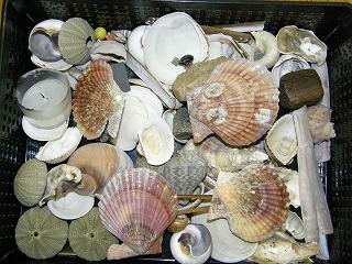 【左】小枝 【中】ニマイガイとハスノハカシパン 【右】アラムシロガイ、ウミニナなど