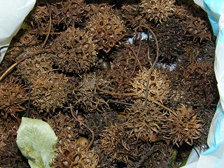 【左】小竹 【中】木の葉など 【右】フウの果実