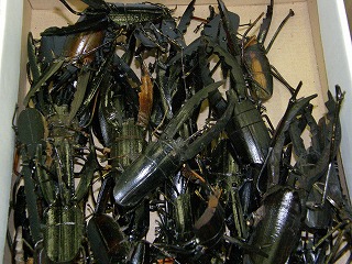 【左】ナンキンハゼ 【中】ツバキ 【右】タケで作ったカブトムシやクワガタ