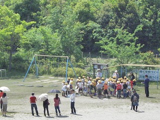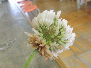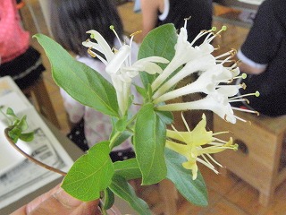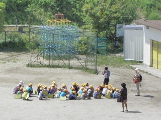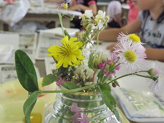 教室で挨拶の後、校庭を右回りに移動し、ビオトープを通って最後は、水槽のある草原で草花遊びをしました。移動中にはミカンの花やドクダミの匂いを嗅いだり、ノイバラのとげに触れたり、まだ熟していないクワの実をかんだりしました。草花遊びは、シロツメクサの指輪とタンポポの笛に皆で挑戦しました。何人かの児童は初めての経験でタンポポの笛を鳴らすことができました。
