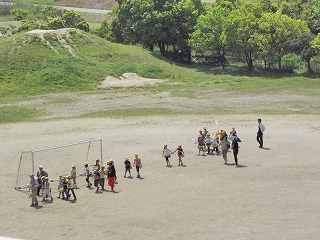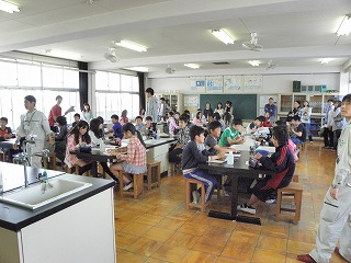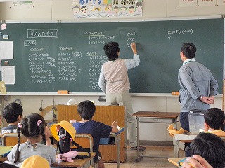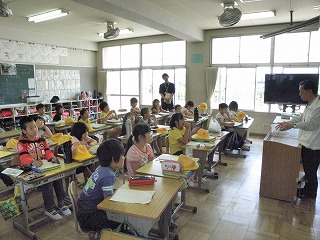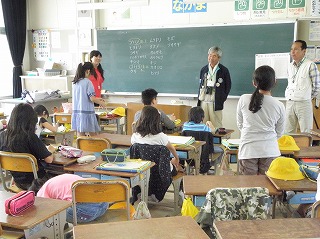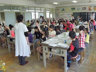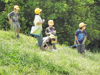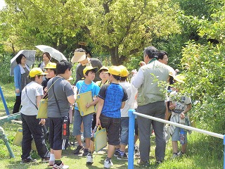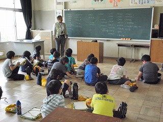 陸上の生き物コースは、トベラのキジラミにはじまって、ミカンの花の所だけでも葉に止まっているものや飛んでいるもの等たくさんの種類のものがみられた。アゲハの幼虫もみられ、どうして黒いのかと尋ねると、鳥の糞のまねをしているという返事が返ってきた。昆虫についての興味関心が全体的に高いと思った。カブトムシの幼虫を捕まえてみたものの、エサの腐葉土を入れるのが大変で回りの子に手伝ってもらいながら水槽に入れている姿も見られた。今年は、どんな虫がどこにいたのかをメモしようということで取り組んだので、メモ用紙いっぱいに表を書いてきちんとメモをとる姿も見られた。教室へ帰って見られたものを発表しあったところ。33種類の昆虫等の生き物を見つけられたことが分かった。天気の良さも手伝ってかたくさんみられたので、みんなおどろいていた。(記・竹内秀)