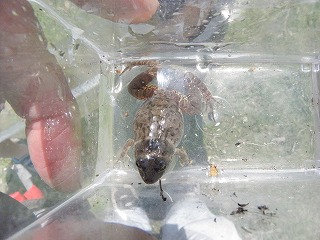 フナビオの東側の水路には階段式の魚道が設置されて、水路の行く先の上野新川から水路を通って魚などがフナビオに入ってこられるように工夫されています。ですから、もしかすると水路にいる生き物はフナビオの生き物が豊かになるかどうかのカギをにぎっているかも知れません。今回見られた生き物は、ミシシッピアカミミガメ(在来種のカメは見つかりませんでした)、ヌマガエル、ニホンアマガエル、ドジョウ(魚はドジョウだけで、さびしい結果でした)、アメリカザリガニ、シオカラトンボのヤゴ、ヒメアメンボ、セスジユスリカ、ヒメタニシ、サカマキガイ、マシジミの一種、エラミミズでした。水のよごれに強い生き物ばかりで、種類も多くありませんでした。水路の底に枯葉などがたくさんたまっていてそれが腐ることによって水質が悪くなっているのかも知れません。(記・榊原靖)