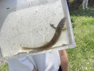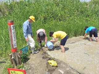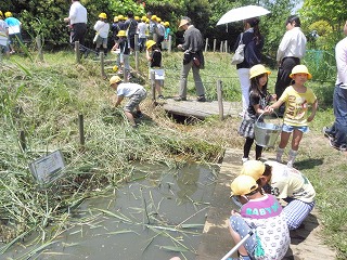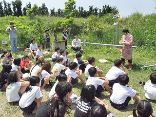 真っ青な空、汗ばむ陽気の中、今年もフナビオ観察会が始まった。今年は、@水の中の生き物と、A陸上の生き物の二つのコースに分かれて行った。