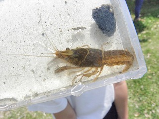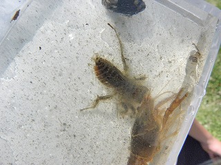 水の中の生き物コースでは、年々ヘドロがたまってきて、ビオトープの中に流れがなくなってきていることもあってか、ザリガニがたくさんと、ドジョウが2,3びき見つかっただけということだった。