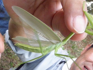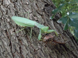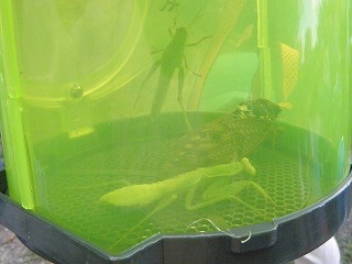 【左】カマキリがセミを食べているみたい。 【右】どんな虫を採ったか見ています