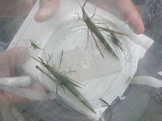 【左】オカメコオロギ 【中】アブラゼミ、ハラビロカマキリ幼虫?、クルマバッタモドキ? 【右】ショウリョウバッタ、イボバッタ?、オンブバッタ?