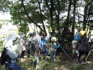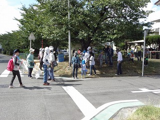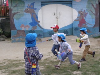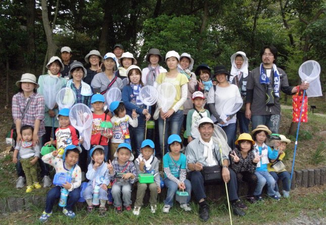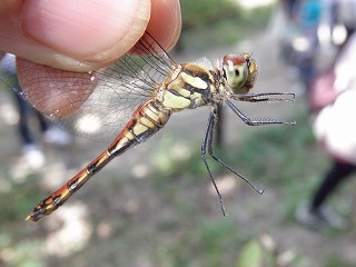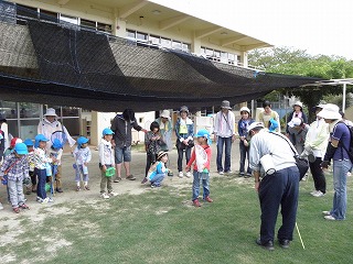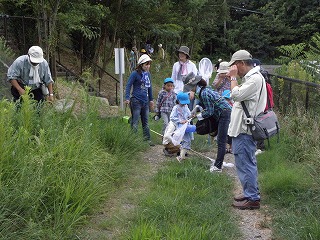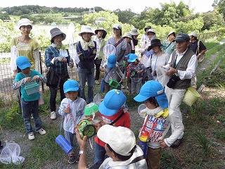 予報は曇り、しかし晴れて暑い日になりました。三つ池小学校の下見をし、コースを決めた後、三つ池保育園に戻り9:30に全員園庭に集合しました。園長さんの挨拶、指導員自己紹介、降幡さんの話、コース説明の後、二班に別れ、トンボグループを私と岩崎さんがセミグループを平田さんと吉房さんが受け持ち、保育園を出発、三つ池小に向かいました。途中の公園や小学校入り口の桜並木付近の自然観察、虫取りで時間を費やしてしまい、下見で決めた校庭一周コースを大幅に変更、校庭東の観察路周辺だけの観察になりました。二班に分かれて始めましたが観察路で一緒になり、分けた意味はなくなりました。二班で行動するにはもっと綿密なコース、時間の設定が必要と反省しました。10:25に観察を終了、木陰に集まり捕らえた虫の分かち合いをして保育園に戻りました。園長さんの挨拶、降幡さんがまとめをしてほぼ11:00、時間どおり観察会を終了しました。セミ、チョウチョ、トンボ、バッタを園児は勿論、親御さんも追いかける楽しい観察会になりました。(記・平松俊)