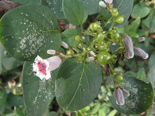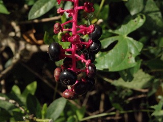 【左】ヨウシュヤマゴボウ 【中】ヘクソカズラ(ヤイトバナ、サオトメカズラ) 【右】フジの花(狂い咲き)