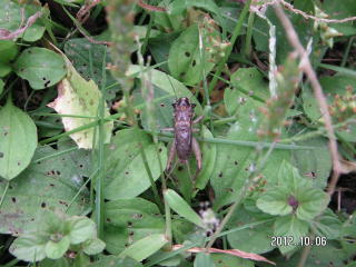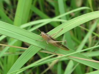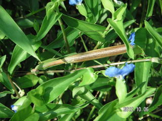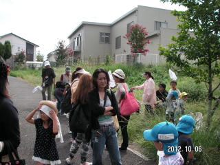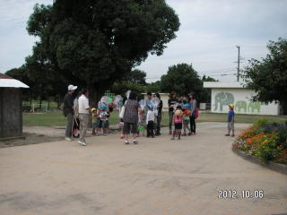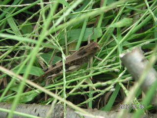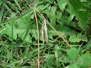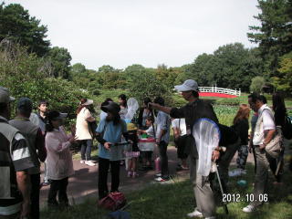 内容:9:40にスタッフ全員が園駐車場にそろい、市職員と一緒に職員室に入りました。グループ分けなど少し打ち合わせをしてから園庭に参加者全員が集合し、2班に分かれ、岩崎さんと山田さんがライオン組16名を、小島さんと中井さんがゾウ組12名を受け持ちました。園長先生の挨拶の後、スタッフの自己紹介をしただけで行程や注意事項の説明を忘れ、そのまま上野台公園に向け出発しました。途中カタバミを使った理科実験とカタバミとヤマトシジミの関係について小島さんからお話を聞きました。上野台公園入り口のスロープ両側の草むらでヒッツキムシとカに悩まされながら昆虫の観察というより虫取りを始めました。ここで2班は合流して1グループになりました。園から公園までは車の通る道を歩くので安全上2班に分けた意味はあったと思います。市の計らいで虫取りを予定した草むらが草刈されずに残ったのでスロープおよびスロープ下の草むらでたくさんのバッタが見つかり園児たちは楽しく虫取りができました(感謝)。しかし10月に入り時期的に遅く、山田池の周りはほとんどトンボが見られず、トンボ取りはさえずがっかりでした。10:40に観察(虫取り)を打ち切り池の東に全員集まり、捕まえた虫の分かち合いをして11:00過ぎに観察会を終了しました。虫かごはバッタであふれ。エンマコオロギが何匹も入ったかごもありました。分かち合いの最中、岩崎さんが山田さんから双眼鏡を借りて熱心に木の上を探し始めました。サメビタキという珍しい鳥が見つかったそうです。山田さんが女の子と一緒に作り、女の子が誇らしげに帽子に飾っていたティアラを写真に撮らなくてすみません。中井さんが持参したガなどの貴重な生態写真を見せる場を作らなくてすみません。分かち合いが長引いてダレるなど反省点は多いですが今回もけが人、体調不良者を出さなかったのは幸いでした。(記・平松俊 )