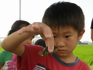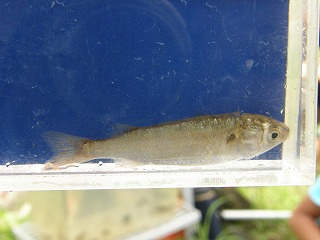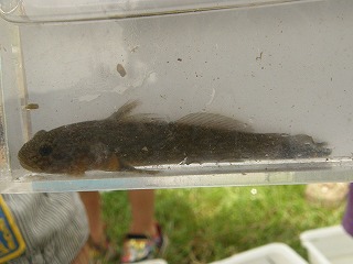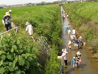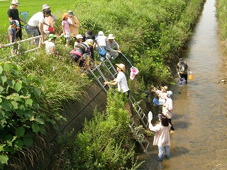 暑い日になりましたが養父保育園に通っている幼児と保護者が元気よく集まりました。簡単な挨拶の後、徒歩で横須賀新川の〇〇橋まで移動しました。堤防から川面まで3m以上ある場所でしたので皆さん慎重に川まで下りました。本来はこのような危険な体験はすることがありませんが当会として危険が起きたときの対処として体験をしていただきました。全員川に降りて事故もなく楽しく生き物にふれあうことができました。(記・降幡)