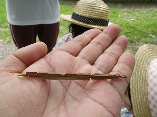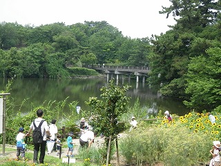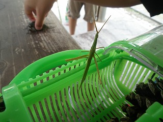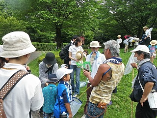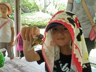 ぎらぎらお日様と競争するように鳴くクマゼミ、アブラゼミたち。初めのうちは、セミの抜け殻をうれしそうにとって大事そうに虫かごに入れていたのに、だんだんそれも飽きる頃になってバッタやチョウを見つけタモを振り回します。かごの中で、食べるー食べられるのバトルを目にする機会にも恵まれました。日陰で水分補給を忘れないようにしながら、真っ黄色にほほえむひまわりの周りを通って水辺にくるとトンボ銀座。ウチワヤンマやコシアキトンボが人間を観察するかのようにすいすい周りを飛び回りますが、子どもたちではなかなか捕まりません。指導員たちが採ったのを虫かごに入れるよう差し出すと、はじめは無造作に羽をつかんでいたのに羽を痛めない安全な捕まえ方を教わるとそれをまねて、一差し指と中指でそっと羽を挟んでかごに入れます。セミの雄がブラジャーをしているといった話に耳を傾け、セミ博士になった子も。人気のカブトやクワガタは見つかりませんでしたが、親子で熱心に虫をつかみ、じっくりと眺めている姿にゲーム以上のおもしろさをつかんでほしいと思ったのは私だけだったでしょうか。気持ちいい汗を流しながら、親さんも子供達も一生懸命で楽しい観察会でした。