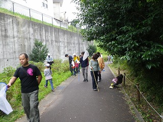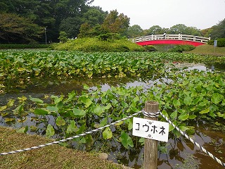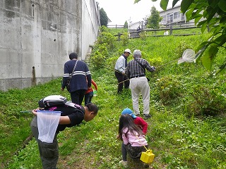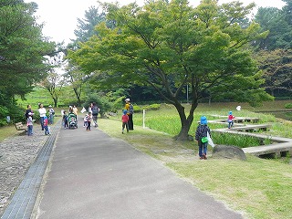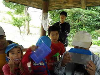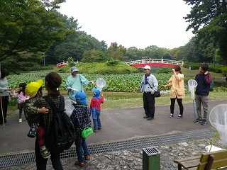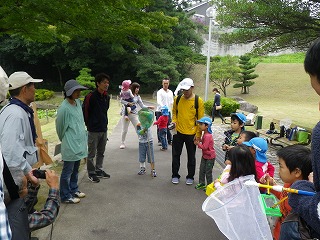 【左】山田池のコウホネ 【中】集合時間ですよ! 【右】早速、トンボ探し、メダカ探し