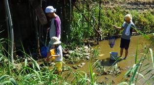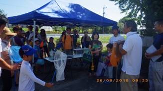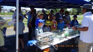 【内 容】 今年は酷暑であっが、今日は暑さも少し和らぎ、絶好の川の観察日和となりました。常連の参加者が昨年もウナギも取れたし、今回も期待してこの川の観察会に参加したと話されていた方も見えて、最後の夏休みでもあり、いつもながら参加者が多い観察会となりました。市の職員の方の挨拶と東海市を流れる川の現状と自然環境についての説明と、観察会をから田中さんから川の生き物の観察方法、捕え方、注意事項等の説明が有り、川の観察が始まりました。生き物との出会いと楽しみと期待をもって、川に入りました。子供たちはタモを片手にお父さん、お母さんと一緒になりタモに入った生き物を嬉しそうにバケツに入れたりし、川のあちらこちらで感激や感性の声をあげて楽しんでいました。今年も昨年より、大きなウナギとフナ、ドジョウ等と最近見られなくなった水生昆虫のタイコウチが捕らまえられ、ミニ水族館をかこみ、分かち合いを行いました。今年はアメリカザリガニが見つからず、ドジョウは増えているようでした。今年も参加された皆さんが楽しく、熱心にこの川の生き物を観察されて、有意義なものになりました。(記:南川)