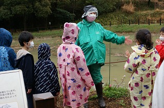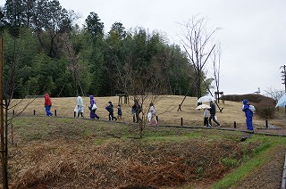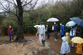 【左】カブトムシの幼虫が育つ丘へ 【中】柔らかくなったくち木で育つカブトムシの幼虫たち 【右】長谷川先生によるジンチョウゲ(沈丁花)のお話