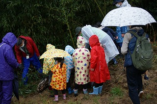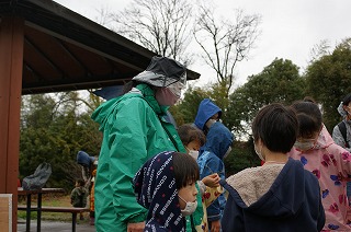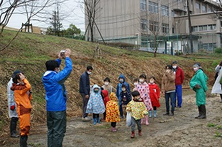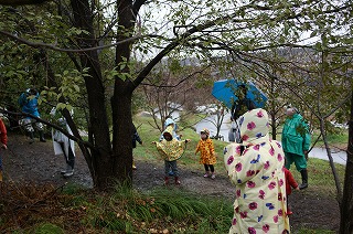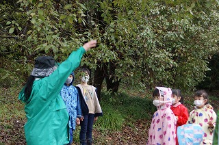 【左】長谷川先生の樹木教室 【中】木の根っこが張っている範囲を手つなぎサークルで描く 【右】ペンペングサ遊び