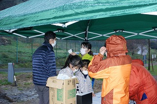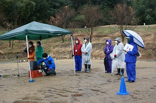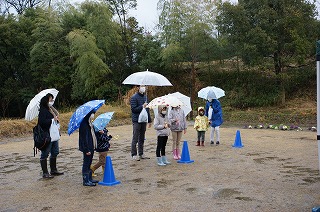 【左】受け付け、検温 【中】開会挨拶 【右】雨中で開会