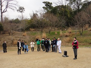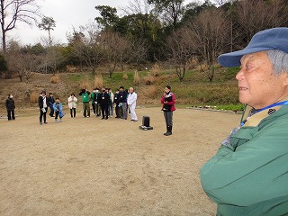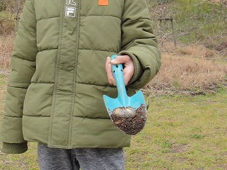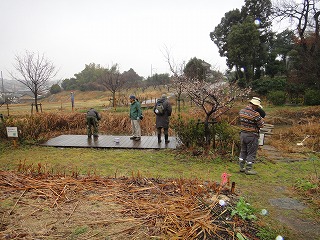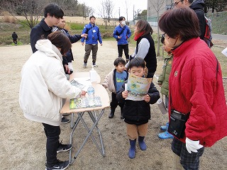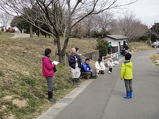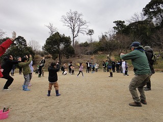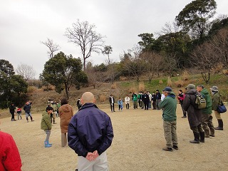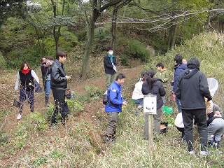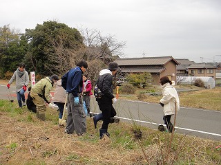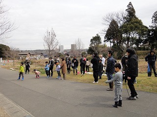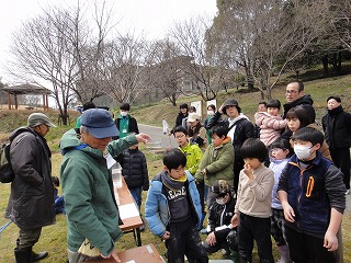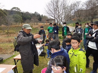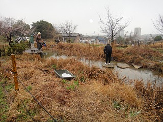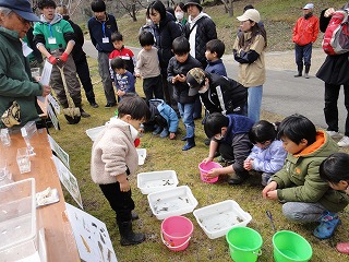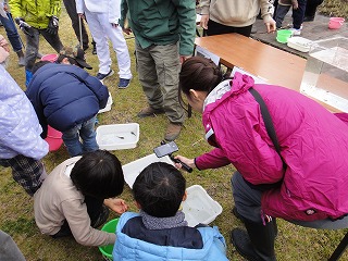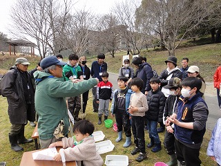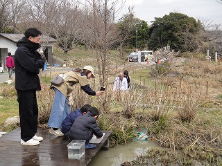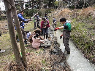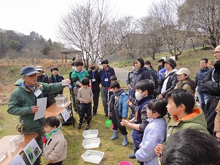 【内 容】 寒空の下、イベントは開始された。オープニングは川崎アンバサダーの明るい挨拶から始まり、今回でプロジェクトは6年目を経過したとの紹介があった。元気な植栽リーダー長谷川講師は定例の生物多様性ストレッチ体操で参加者全員を和ませてくれた。イベント企画@では下池周辺の土手や通路脇にアジサイやヤマブキ計170本を植栽した。イベント企画Aでは池干しした下池と中池でオタマジャクシ、カダヤシ、ザリガニや水生昆虫のヤゴ、ミズカマキリ、巻貝のタニシ、カワニナ等を採集した。水は冷たく直掴みをする子どもは少ない。。幸い提供した頑丈なたも網とバケツ、水洗フネのお陰で沢山の生きものを採集する事が出来た。採集した生きものは展示机上の水槽やトレーに分別して、田中、降幡講師が解説した。話題も豊富で参加者の耳目を集め好評であった。少し遅れたがイベントは無事に進行し閉会式を迎えた。川崎アンバサダーから次回5月6月のヘイケボタル放流イベントを案内して閉会した。