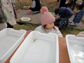 スジエビ、アメリカザリガニ、ウシガエル(幼生)、ミズカマキリ、ヤゴ(シオカラ)、タニシ(ヒメ、マル)、カワニナ、イトミミズの仲間、カダヤシ、メダカ8持参)
