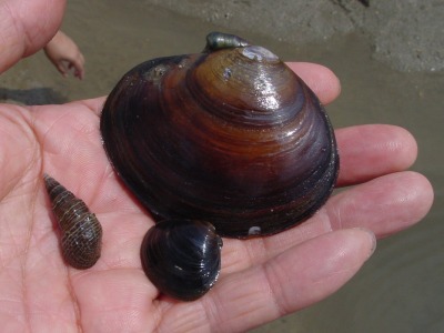 【右】大きいのがイソシジミ。小さいのがヤマトシジミ。巻貝がヘナタリガイです。いずれも汽水域に住んでいます。