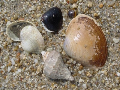 【右】矢作砂の上に置いた貝殻です。アサリ、ヤマトシジミ、バカガイ、アカニシです。