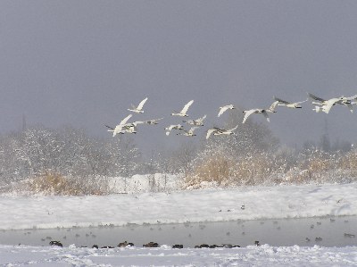 【左】南安曇郡穂高町狐島の水田に水を張り、白鳥に餌を与えています。