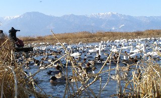 【左】「御宝田」のハクチョウとカモ類。富士山みたいな山は有明山。別名、安曇富士。