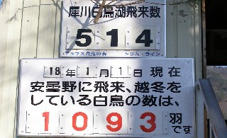 【右】犀川ダム湖の白鳥管理棟前の掲示です。