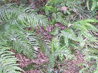 【左】ため池          【右】ウラジロ(左)、コシダ(右)