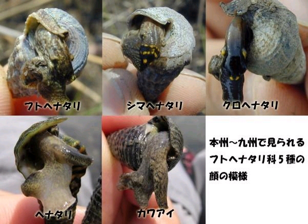さて、投稿していただいた写真の貝は、手前の軟体部を出している個体は顔の模様からシマヘナタリです。後ろの個体も縦肋(縦の畝)がはっきりしているので同じくシマヘナタリだろうと思います。シマヘナタリは軟体部の顔の模様に特徴があり、口吻の前半(先のほう)は黒色に黄色い斑紋があり、後半(付け根のほう)はクリーム色のまだら模様で、この境目がはっきりと色分けされています。目の周りもクリーム色です。クロヘナタリは口吻全体が黒色で、目の周りと口吻の先端が鮮やかな黄色をしています。フトヘナタリは口吻全体がクリーム色のまだら模様です。シマヘナタリはフトヘナタリとクロヘナタリの中間のような色になっています。 殻が磨耗して殻だけでは見分けづらくても、この顔つきを見ることで3種は見分けられます。さらによく似ているヘナタリとカワアイも顔つきが異なります。参考までにフトヘナタリ科5種の顔を比較として貼っておきます。(この比較は結構需要があると思うので、またコラムとして特集します) シマヘナタリがいるということは、周辺にクロヘナタリも生息している可能性が高いと思います。シマヘナタリはヨシ原内でもやや高い場所で比較的乾燥しているような場所にいますが、クロヘナタリはもう少し低い場所で、ヨシ原内のやや泥っぽくて干潮時にも水溜りや澪筋が残るような場所に生息しているので、探してみてください。他にもいろんなカニなどがいると思います。 わからない生物がいたら気軽にご投稿ください。