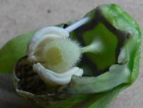 それにしても、開花したばかりの花のめしべについていた粉は花粉だったのか。おしべは確かに5本ある。葯もある。開花したときは、その葯には花粉が殆ど無い。ということで、開花前の蕾を割ってみる。そこには細かい毛の生えたワイングラスと、それを取りまくおしべの葯が出てきた。つまり、葯は開花以前に熟し、めしべに付着する。そのとき、柱頭部分はグラスの内側になっていて、花粉はつかない。柱頭がラッパのようになったとき、柱頭に花粉が着く。と推察する。背中に白い粉をつけたスズメバチが花冠にもぐりこんでいる。これって、自家受粉を避けるのに役に立つ????