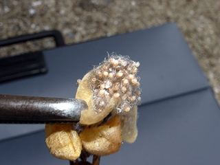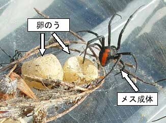 【右】セアカゴケグモの卵のうと孵化した子グモ (約1cmの球状で突起はありません) 写真クリック→大サイズ