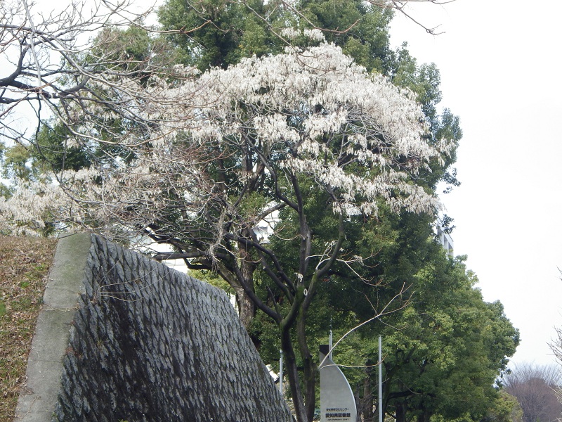 過日(2013.2.17)ヤボ用で愛知県図書館に行ったとき、玄関近くの国道沿いや堀の土手下に“白い花?”を満開にした木があったので(写真参照)、館内の受付でその木の名前を聞いたところ、そこでは、判らなかった。