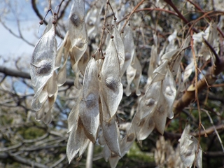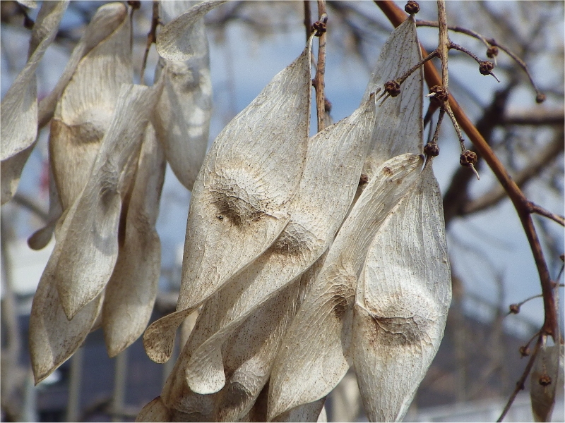 館を出てから、その木の近くに行って見たら、“花”ではなく“種子(翼果)”だった。それを拾って、帰宅後、その種子が何の木なのかネットでチェックしたところ、「シンジュ(ニワウルシ)」であった。ニワウルシは知多半島にも野生の幼木があり見たこともあるがこのような姿は初めてだったので本日(2013.2.27)ここに紹介することにしました。