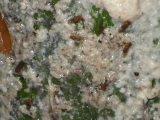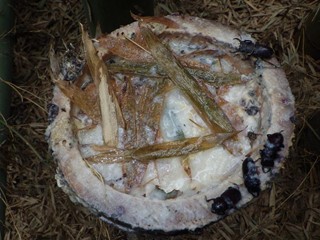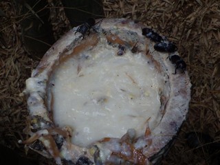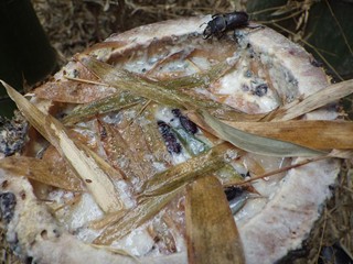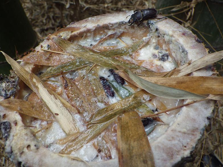【左】枯れ葉(ほとんど竹の葉)を脇に寄せた。 ※私は今回は試飲しなかった  【中・右】ショウジョウバエがたくさん集まっていた