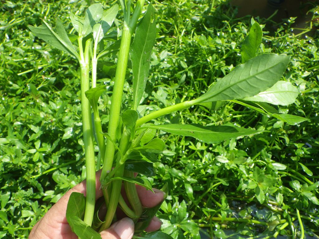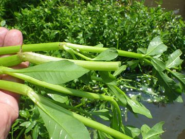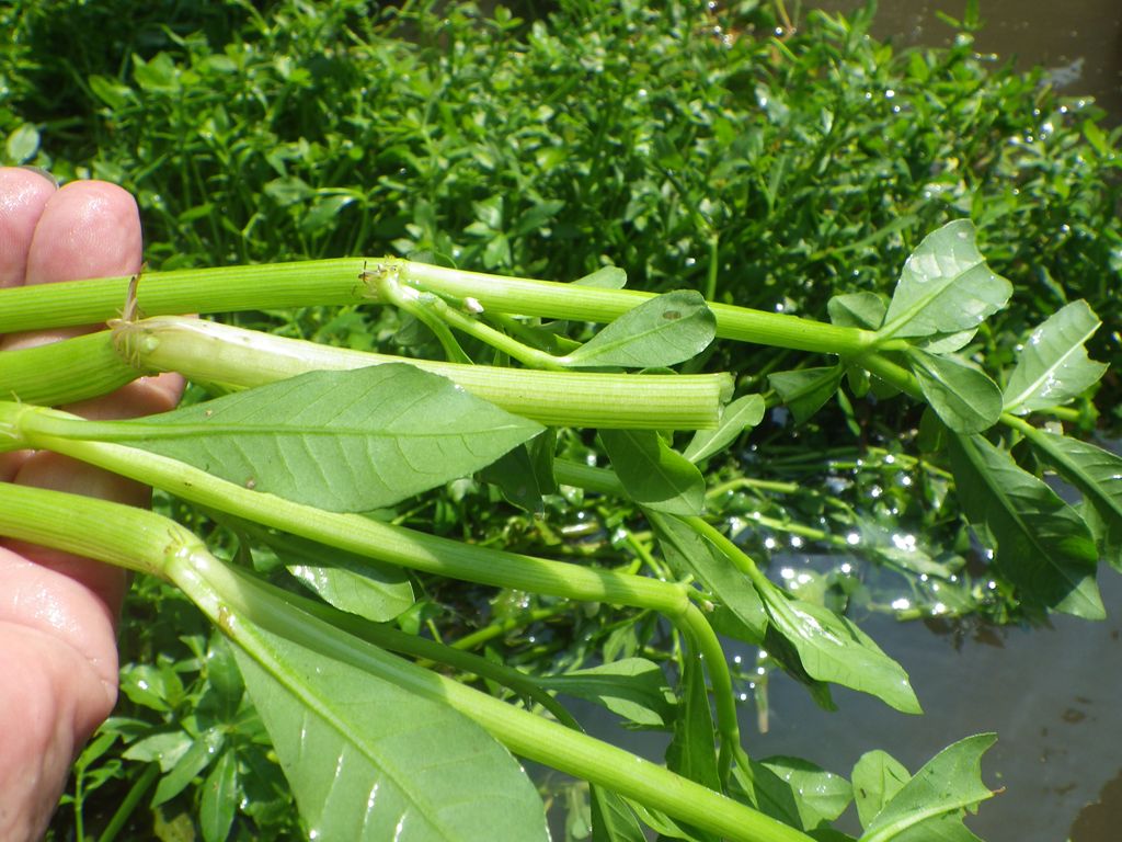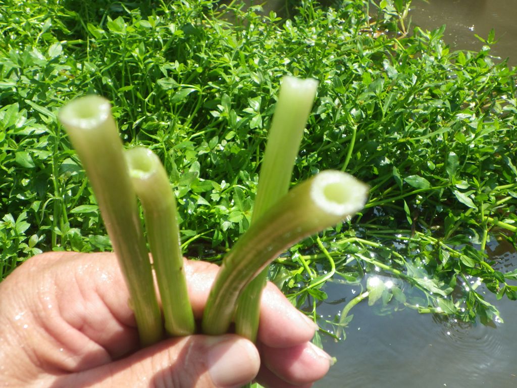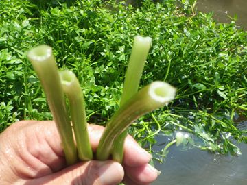【左】茎は空洞 【右】水中の茎。節(ふし)ごとに根が付いている